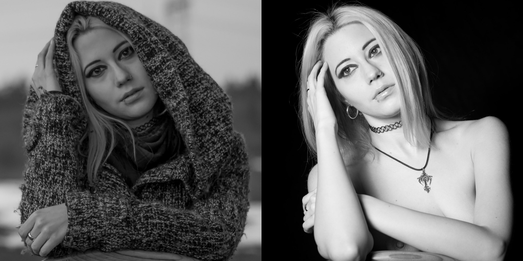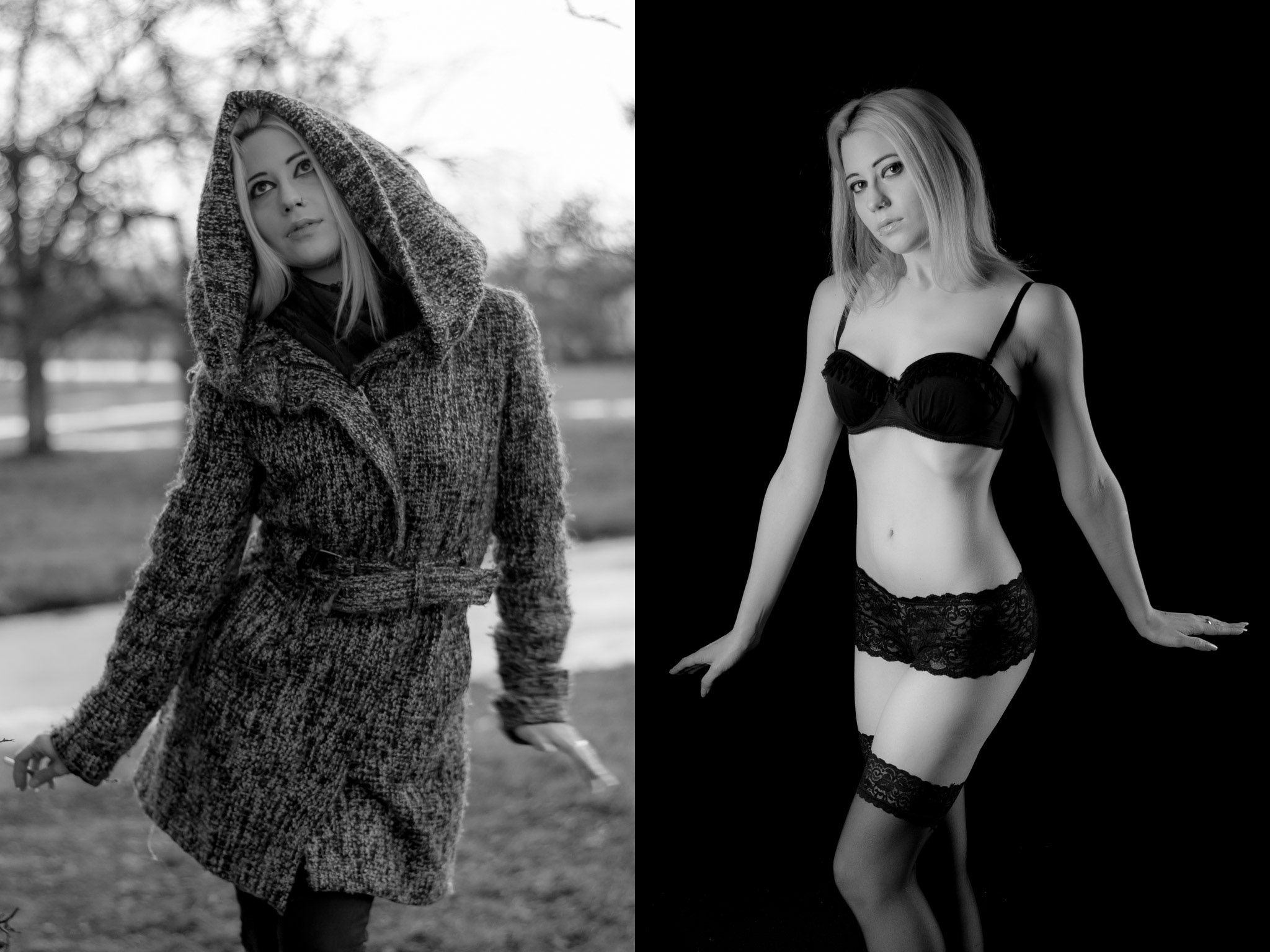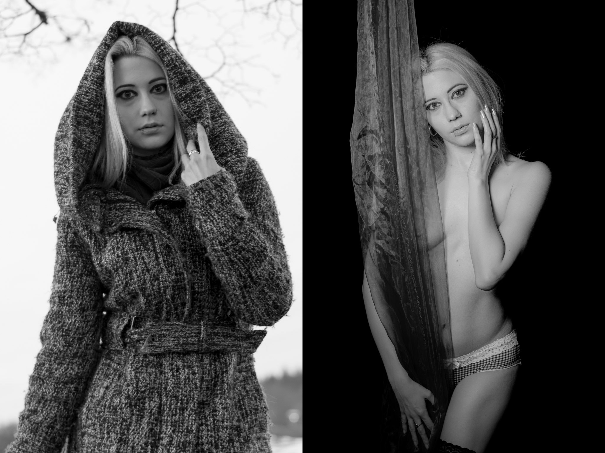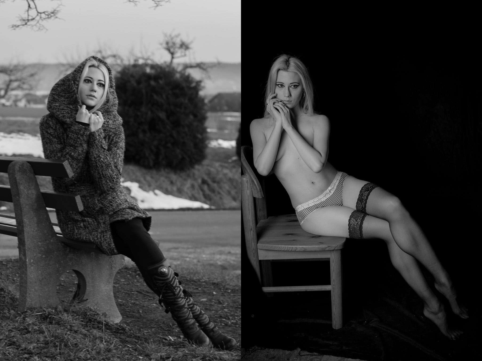 So richtig glatt ging es an diesem Tag ja nicht: Viel zu spät sind wir gestartet um Outdoor ein paar nette Posen zu suchen. Die Sonne war gerade hinter dem Horizont verschwunden und damit waren Bilder mit natürlichem Licht nur noch mit hoher ISO und damit verbundenem Rauschen möglich. Trotzdem haben wir ganz geschwind zumindes drei Posen gezaubert, draußen, dick eingepackt, die dann im Studio mit deutlich weniger Kleidung als verdeckte Teilakte nachgestellt wurden. Es gibt noch einiges zu verbessern und anhand dieses ersten Versuchs habe ich viel gelernt. Trotzdem hier einfach mal ein paar Ergebnisse: